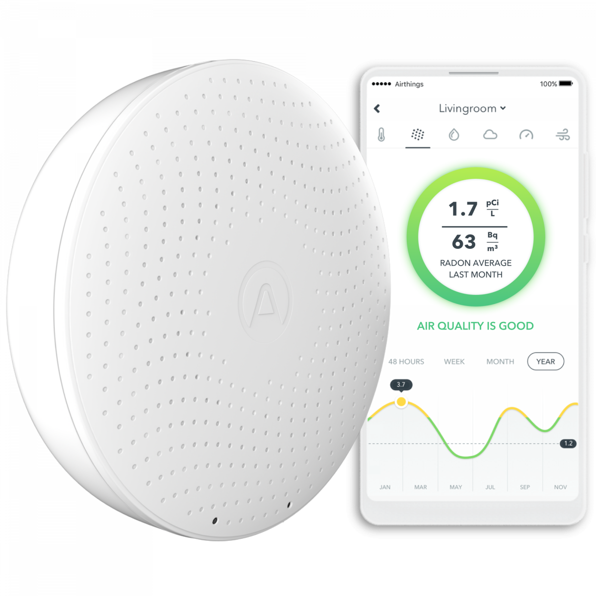 Detectorul inteligent, produs de Airthings, înregistrează nivelul de radon, dioxid de carbon, compuși organici volatili, temperatura, presiune aer, umiditate, din oră în oră și care oferă un grafic al variației concentrației activității lor. Datele citite de detectori sunt